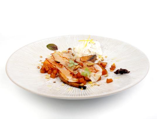 Potimarron rôti, burrata crémeuse et fines tranches de lard de Calabre grillées à la flamme