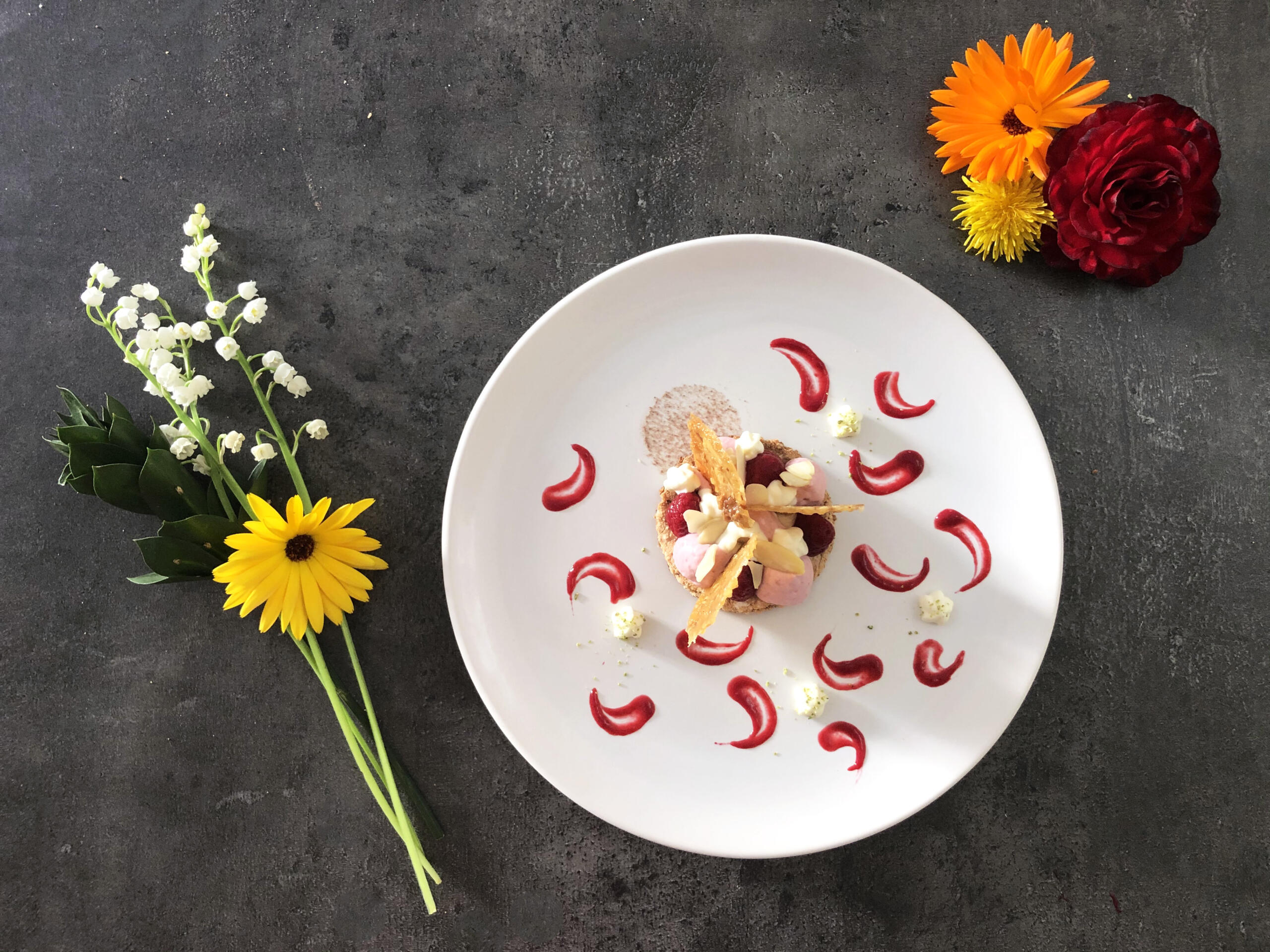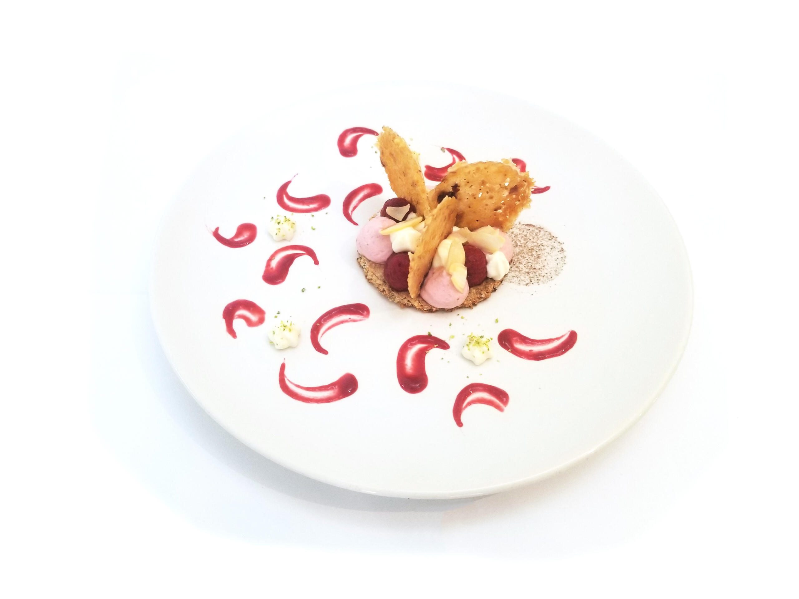 Soak gelatine in cold water. Blend raspberriess and add rose water. Heat half of theu coulis and melt the gelatine. Then add to the remaining coulis.