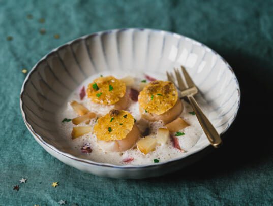 Recette signée par Astrid Fronteau @chhhop Ingrédients pour4 entrées : 12 noix de St-Jacques Terroirs d’avenir 2 tranches de jambon bellota 1 échalote 25 cl de lait entier Bordier 50g de…
