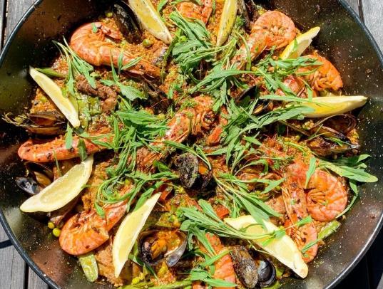 Ingrédients pour 4 personnes 1 poivron 10 gousses d’ail 1 lapin coupé 500g d’échine de porc 10 gambas 10 moules 500g de petits pois frais 1 botte d’asperges verte 300g…