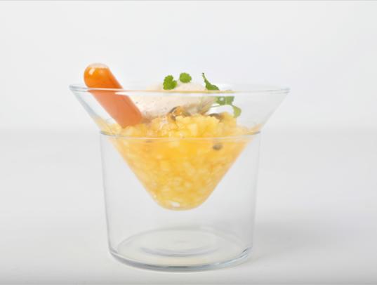 Ingrédients (pour 4 personnes) : 1 Ananas Victoria (bio ou issu d’un agriculture responsable) 1 fruit de la passion 1 citron vert Sorbet Mojito Glazed 1 bouquet de menthe fraîche…