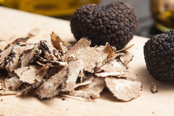 – Divide the velouté between 6 soup plates. Drizzle truffle oil over each and decorate with truffle shavings or chips. Season with salt and pepper and serve immediately.