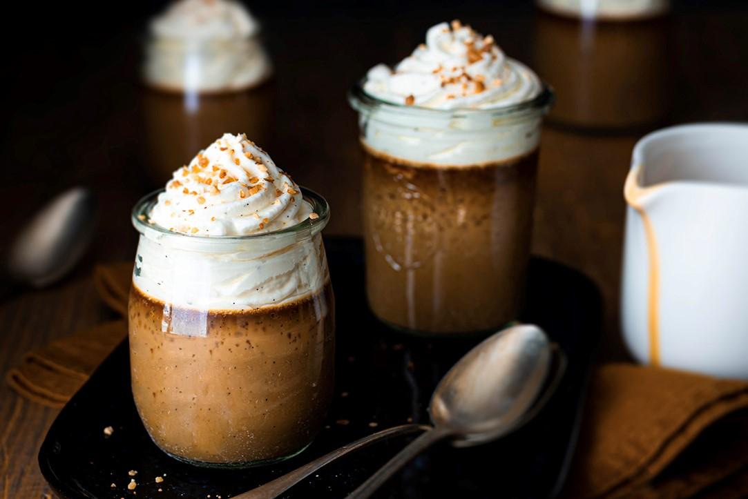 Remove the jars of cream. Pour the whipped cream into a piping bag with a notched tip. Make pretty cream domes on each little pot. Sprinkle with a pinch of praline