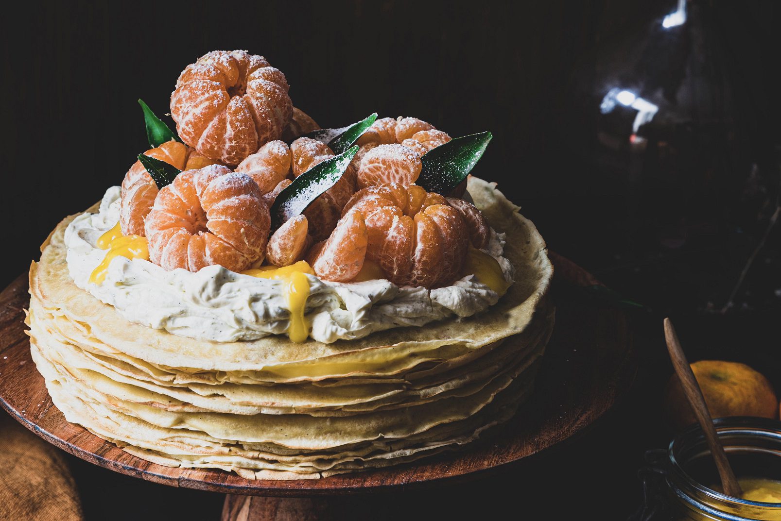 Assemble the cake, alternating a thin layer of clementine curd, a crêpe, a thin layer of vanilla cream, a crêpe, and so on. Finish the cake with a thick layer of cream, then add curd tips and a few clementine wedges as a topping.