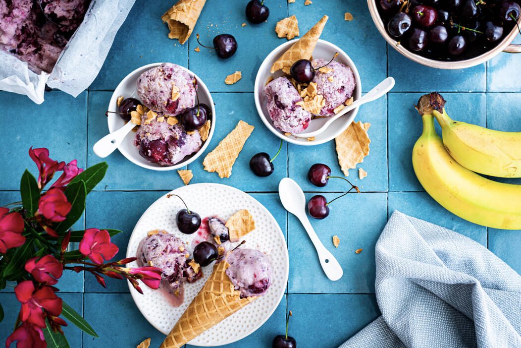 The day before, pit and halve the cherries. Slice the bananas. Mix the fruit and place in a bag in the freezer. The next day, place the fruit in a blender and blend in the coconut milk and cane sugar syrup. To add texture and sparkle to the ice cream, add a few cherries at the end. Line a cake tin with baking parchment and pour in the mixture. Place the mould in the freezer for a further 2 hours.